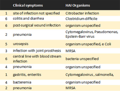 Patient outcomes determined from de-identified records were related to room conditions. Multivariate statistical analysis with linear regression was run to evaluate correlation between indoor measurements and new patient infections (HAIs). HAIs as shown below were found.